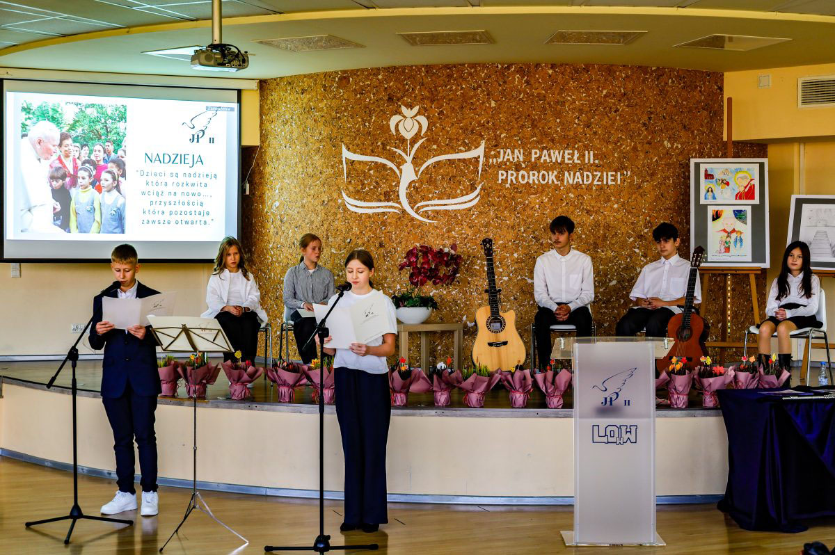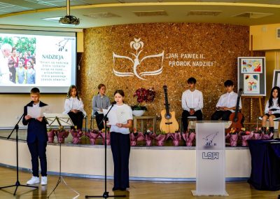 Po Eucharystii uczestnicy udali się do szkoły, gdzie dyrektor Zespołu Szkół, pani Ewa Włos, powitała zaproszonych gości. W auli zaprezentowano montaż słowno-muzyczny pod hasłem Jan Paweł II – Prorok Nadziei. Program artystyczny, przygotowany przez uczniów, skłaniał do refleksji nad rolą nadziei w życiu człowieka, podkreślając jej znaczenie w codziennych wyborach i relacjach.